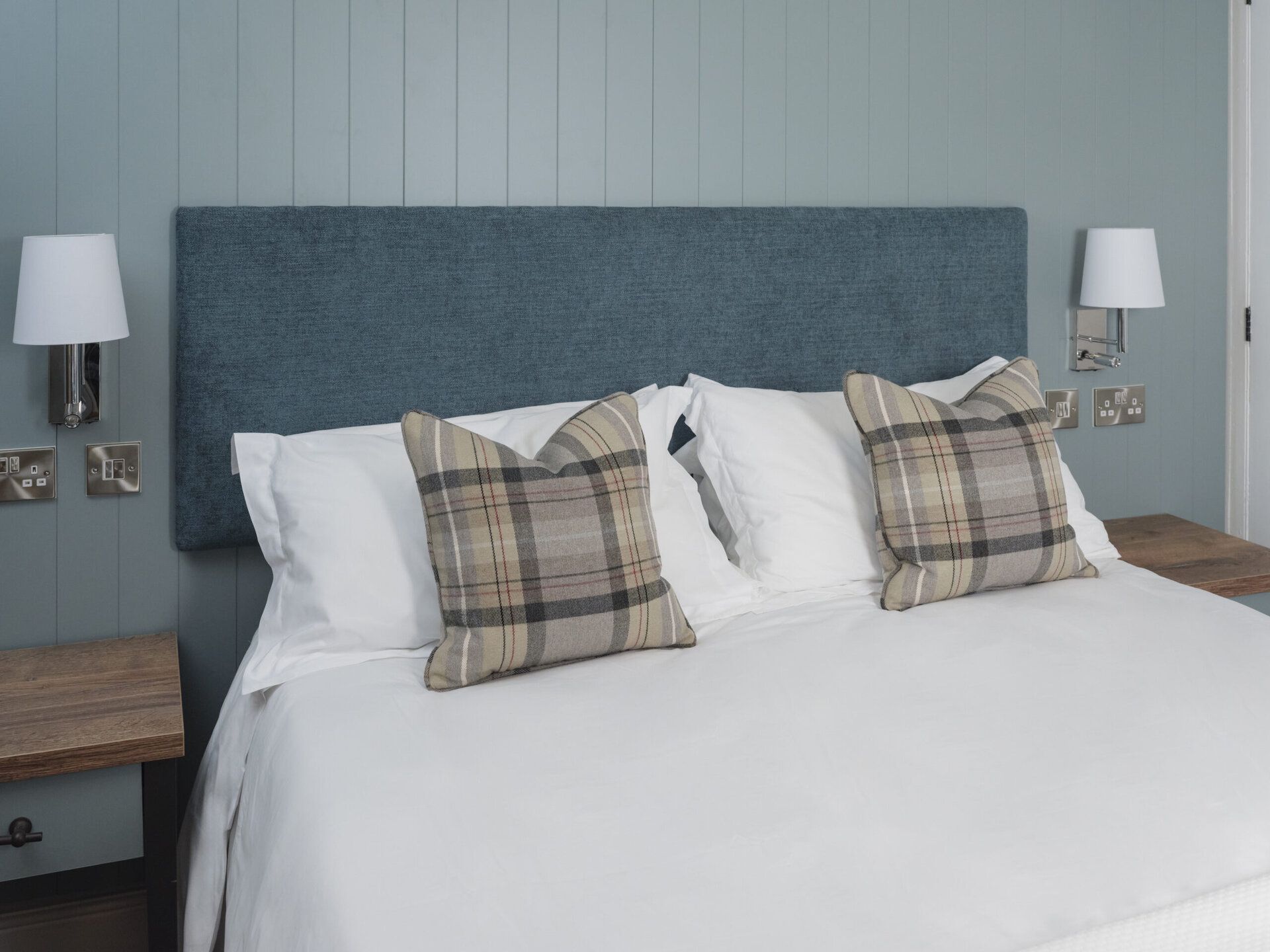 Intimate double with panoramic Snowdonia views, a king-size bed dressed in crisp linens, underfloor heating and plush plaid cushions. Includes a desk area with Nespresso machine. Perfect for couples seeking a peaceful, characterful retreat.
